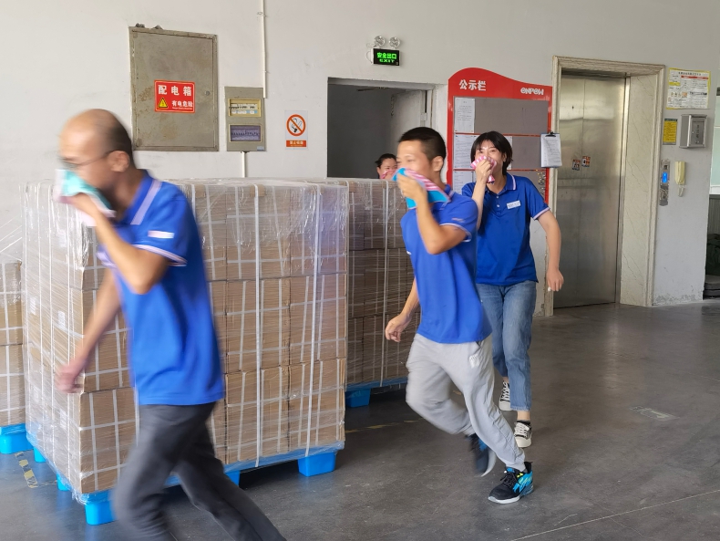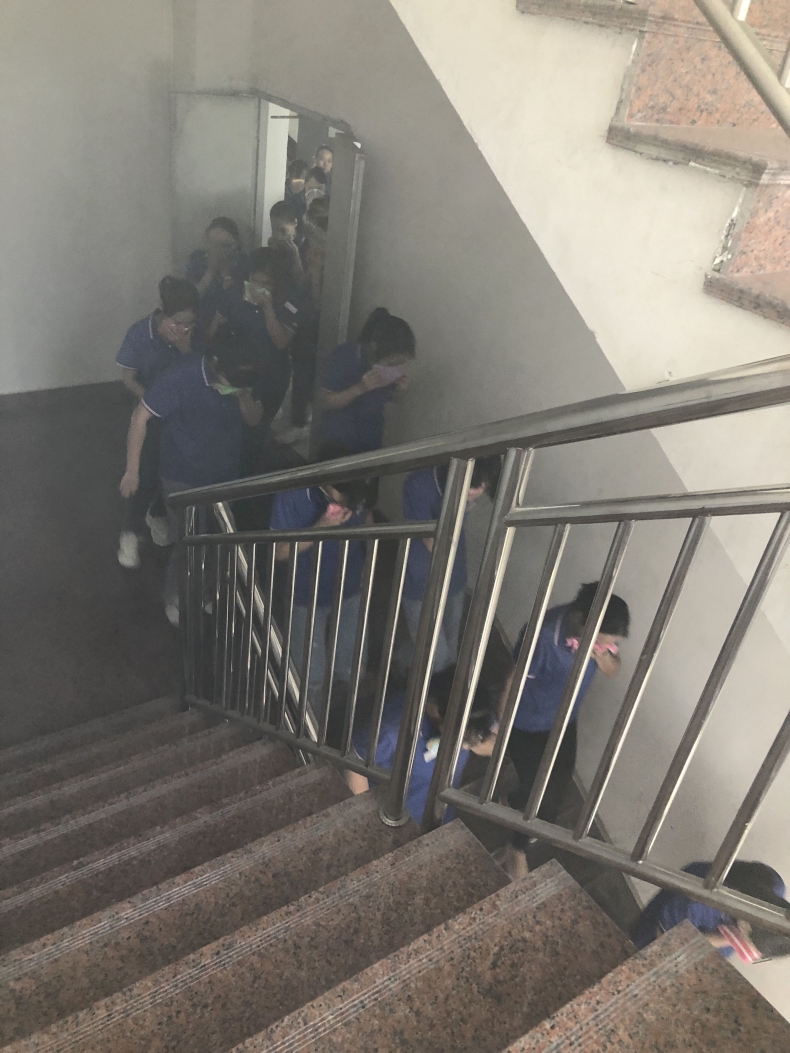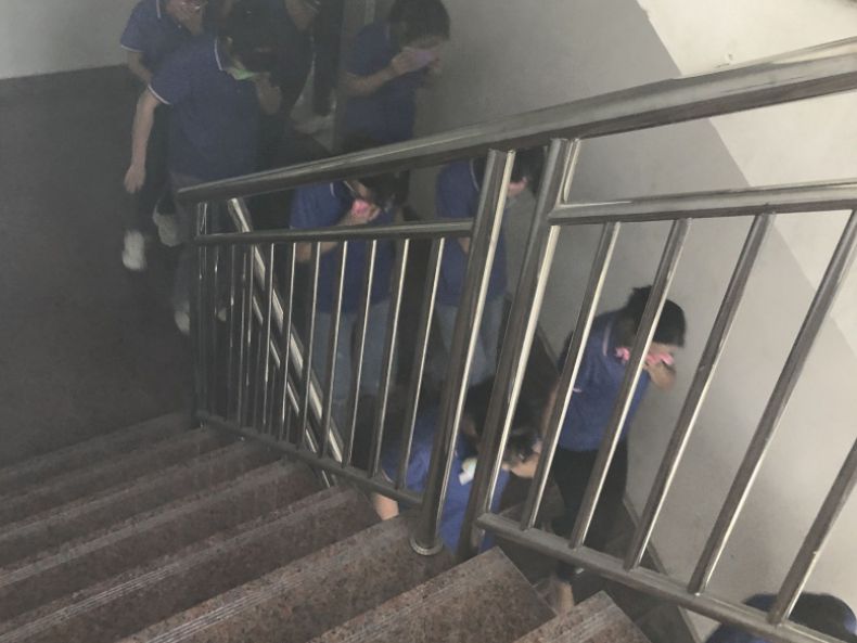 隨著單元樓火警警報聲響起,車間員工迅速從安全樓梯疏散,低頭彎腰同時用手或濕毛巾捂住口鼻迅速往安全通道撤離。